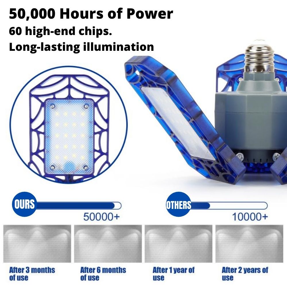 This bright LED garage light features three adjustable bulb heads that deliver 50,000 hours of brightness where you need it. Energy-saving, low consumption, and low-heat generating, the power of ultra-strong LED means less money out of your pocket for electricity.